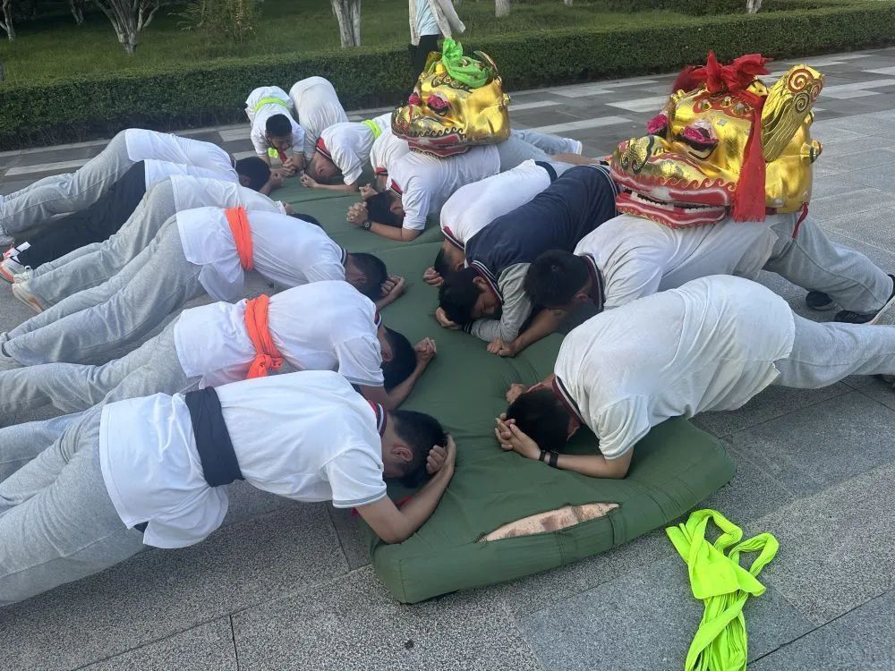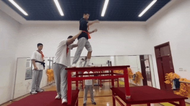 天府第七中学北狮队队员们从零开始,一招一式学习。他们每周利用课余时间练习三次,从基本体能和武术功架练起,进行俯卧撑、长跑等耐力训练,学习高举、坐肩、滚翻等基本功,徒手练习合格后再加道具。