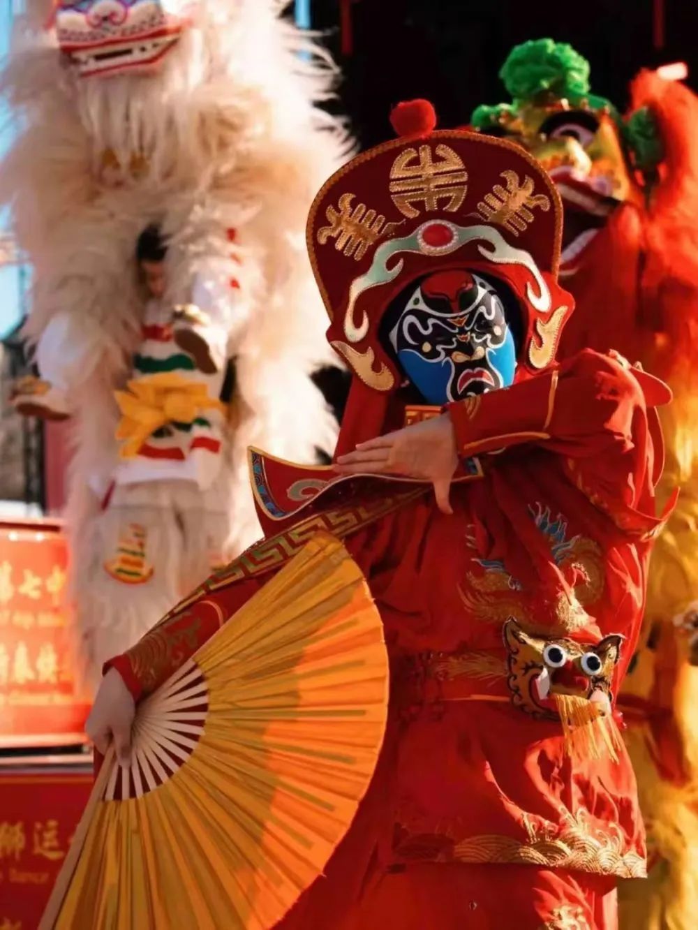 “狮子”旁,两名身着戏服的表演者扭头间拂帽甩带,扇子开合瞬间变换脸谱。